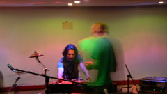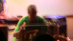 assorted soundmaking tools. The two men at the back of the low stage, replete